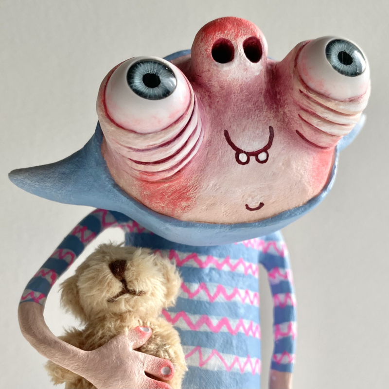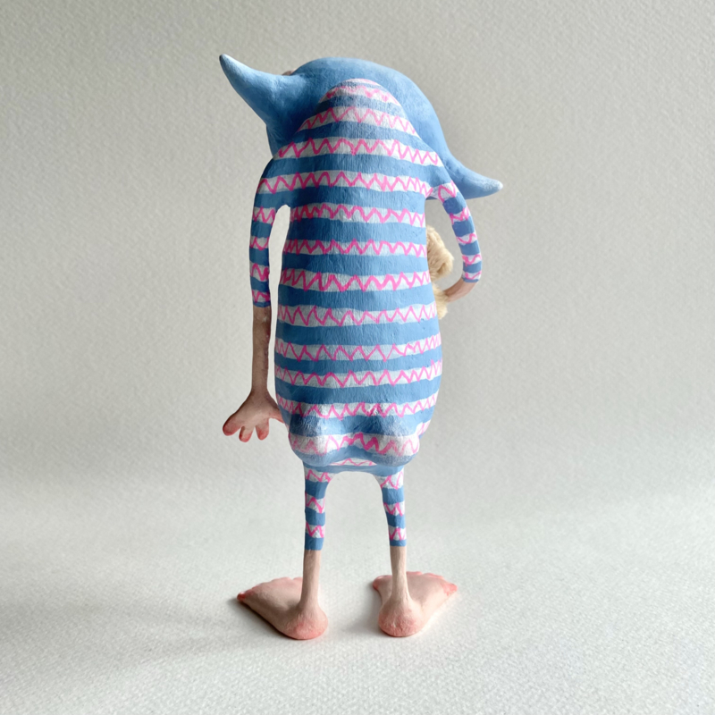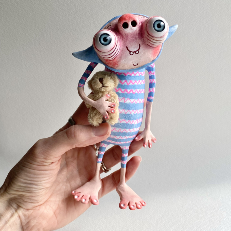Gekleed in zijn blauwe onesie met witte en neonroze strepen is hij altijd klaar voor een dutje, een dagdroom of een klein avontuur dat niet al te wild wordt. Elmer is niet het luidruchtigste of dapperste monster, maar misschien wel het vriendelijkste, en als je goed luistert, fluistert hij soms kleine bemoedigingen tegen zichzelf.