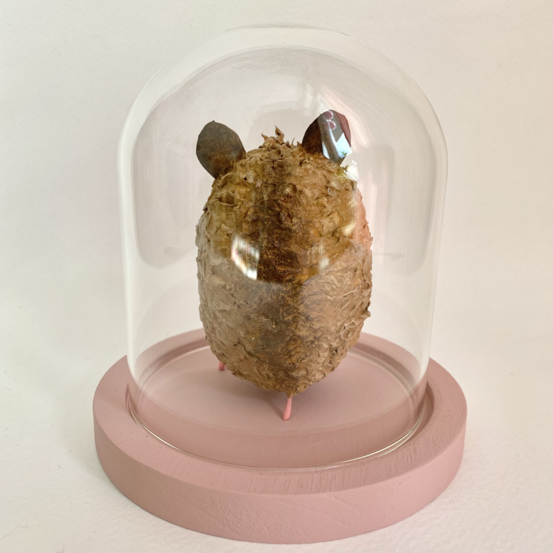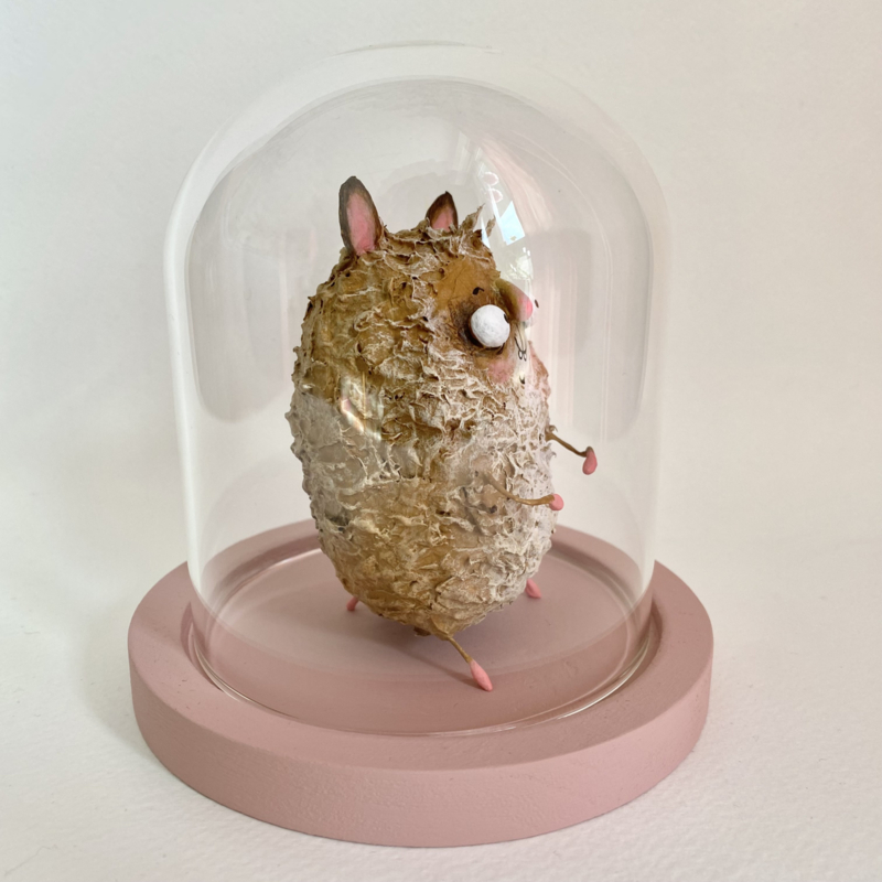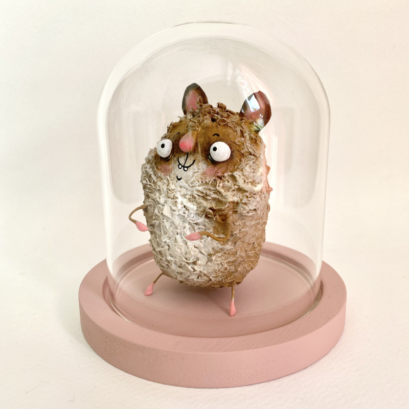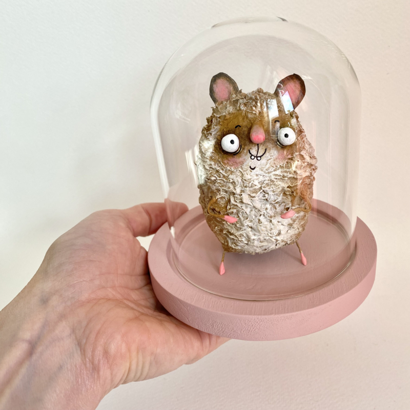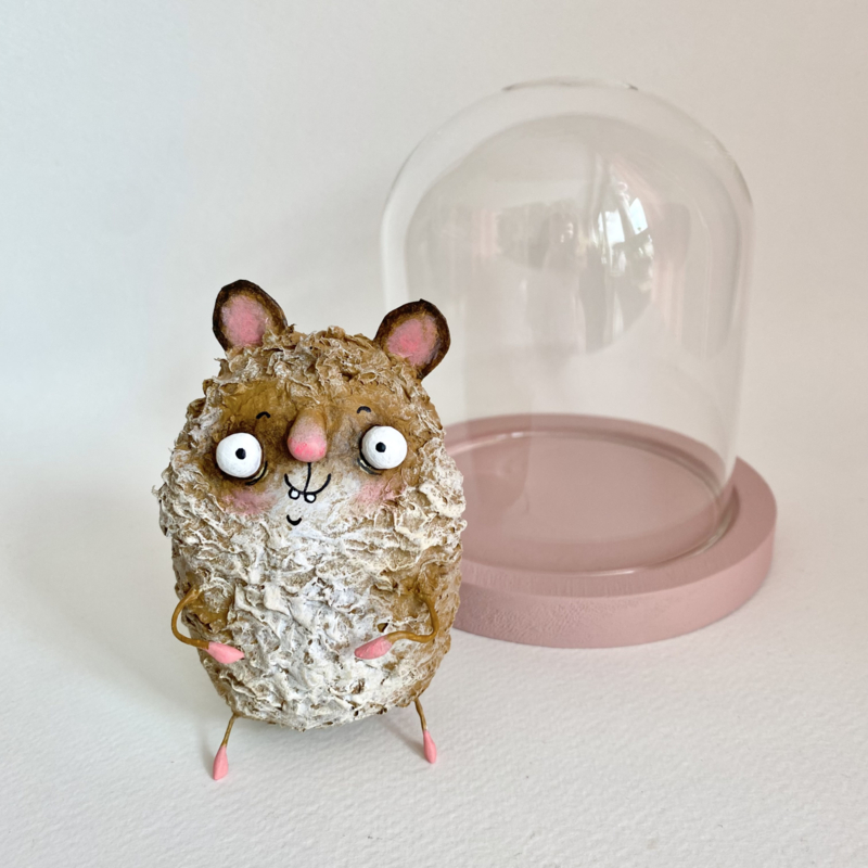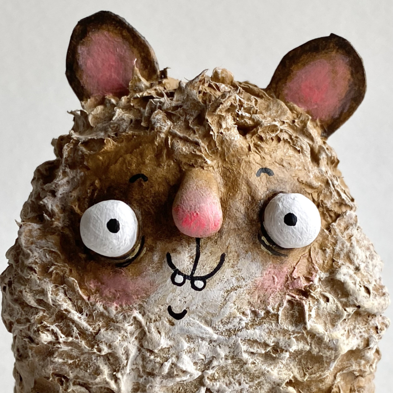 De hamster is handgemaakt van papierpulp en afgewerkt met acrylverf.