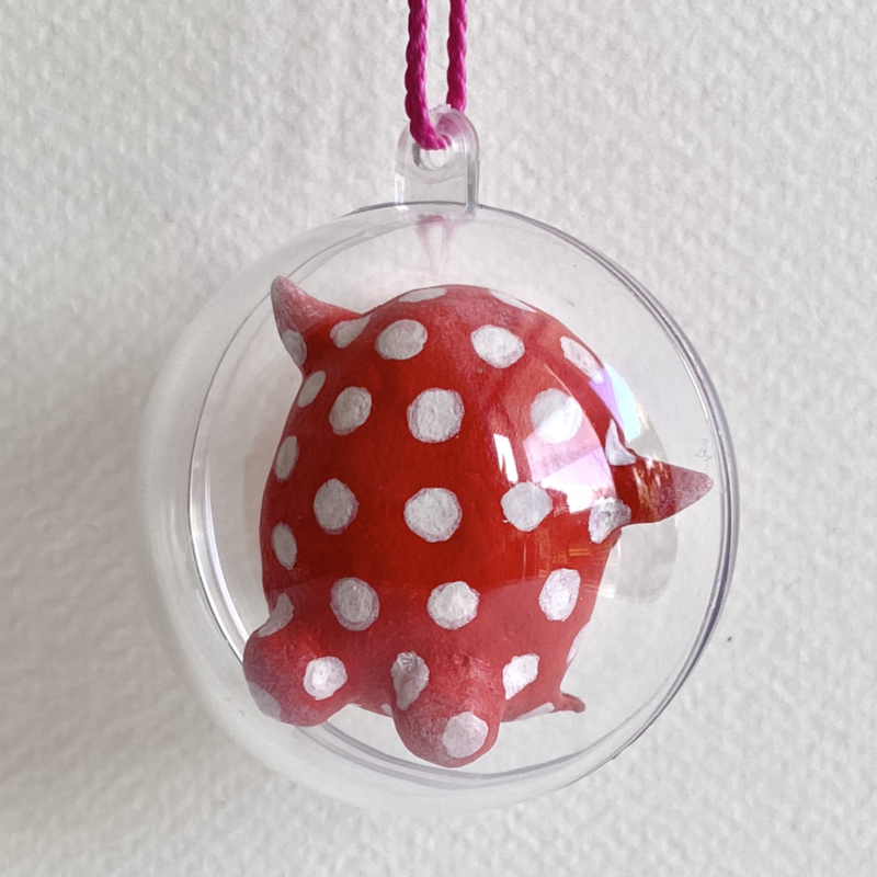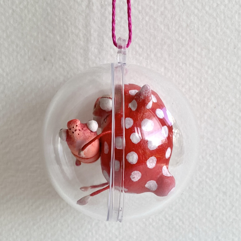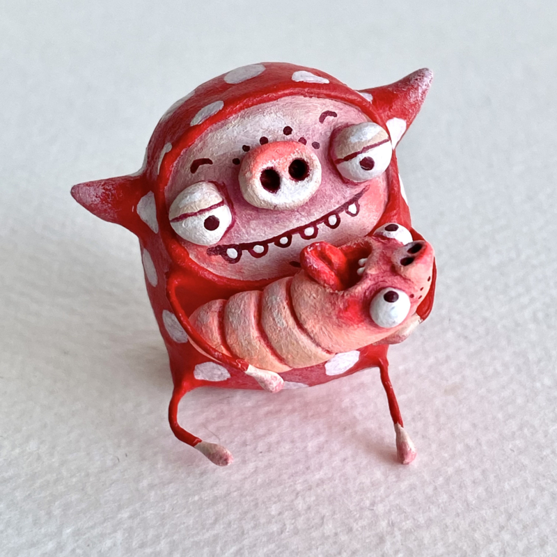 Bitty the micro monster and her little worm are handmade from paper pulp and painted with acrylic paint and they come tucked inside their own hanging plastic bubble with a pink string, perfect for dangling anywhere.