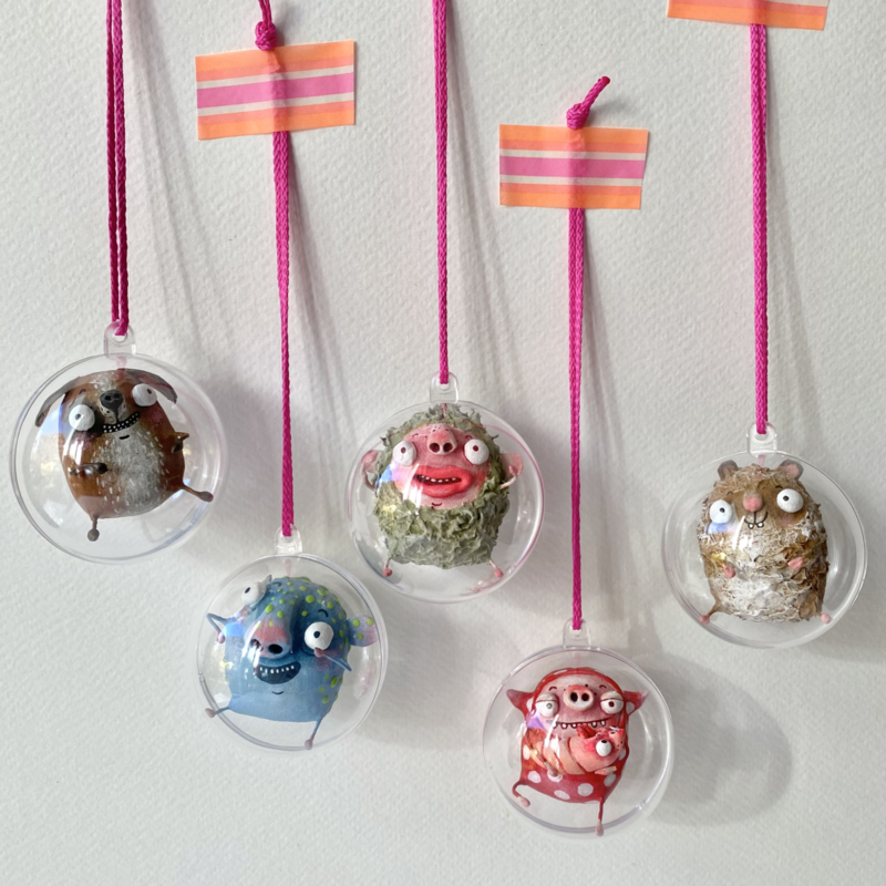 Blor the micro monster is handmade from paper pulp and painted with acrylic paint and comes tucked inside his own hanging plastic bubble with a pink string, perfect for dangling anywhere.
