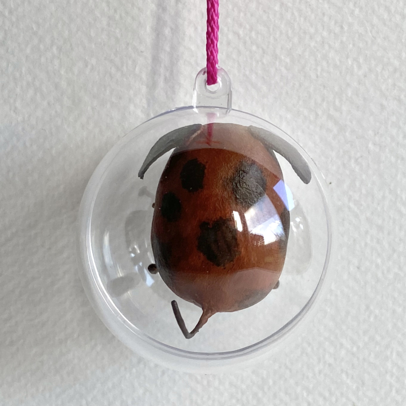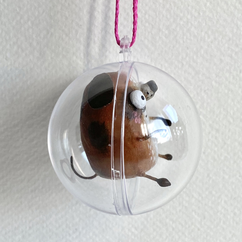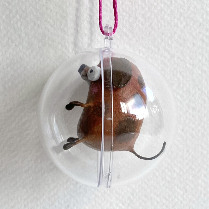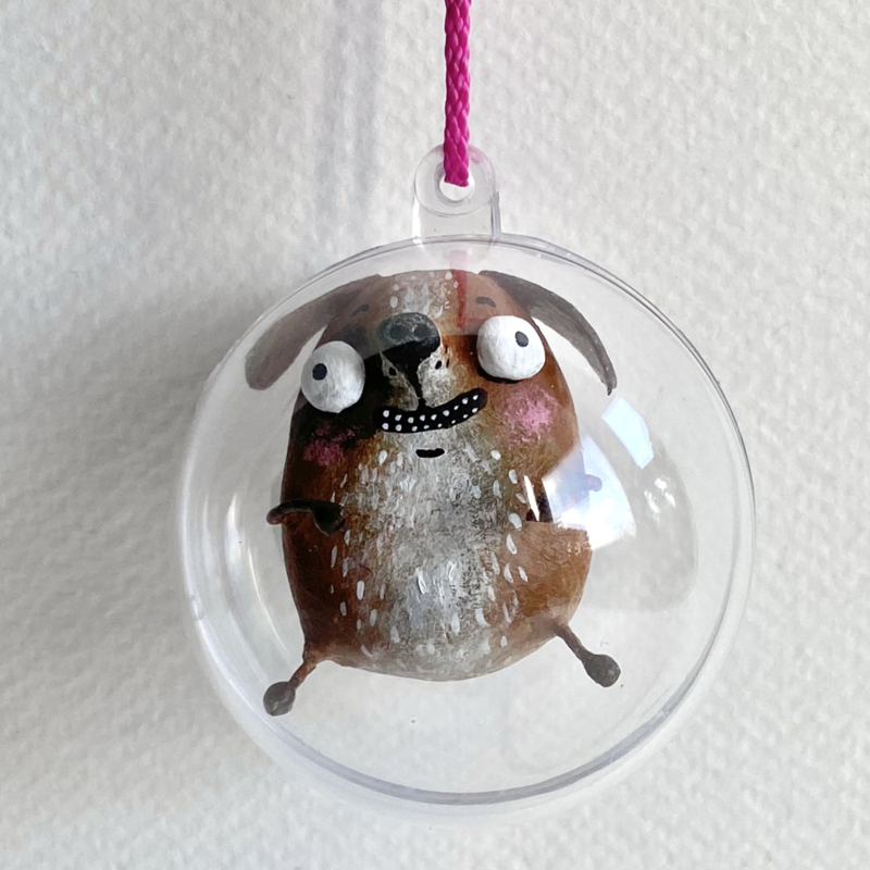Puddle the micro doggie is handmade from paper pulp and painted with acrylic paint and comes tucked inside his own hanging plastic bubble with a pink string, perfect for dangling anywhere.