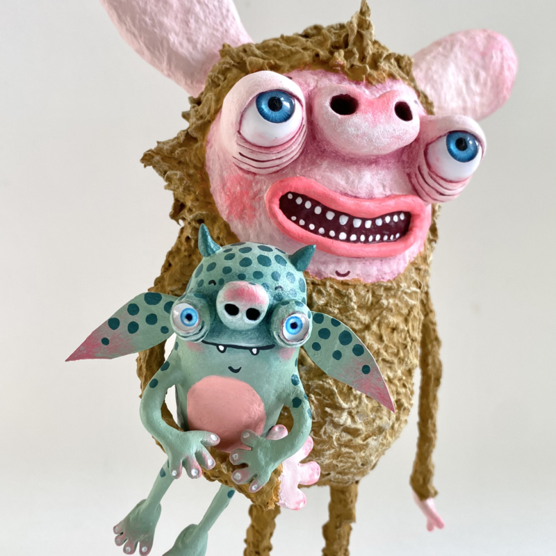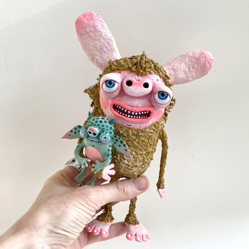 Durk and his little buddy are handmade out of paper pulp and painted with acrylics and Durk has big acrylic eyes.